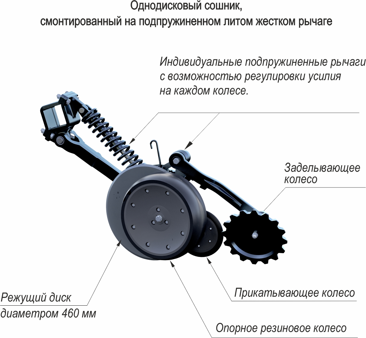 Особенностью данного посевного комплекса является система раздельного внесения сухих гранулированных удобрений в однодисковый сошник, смонтированный на подпружиненном литом жестком рычаге с опорным резиновым колесом, что позволяет развивать усилие врезания до 210 кг.